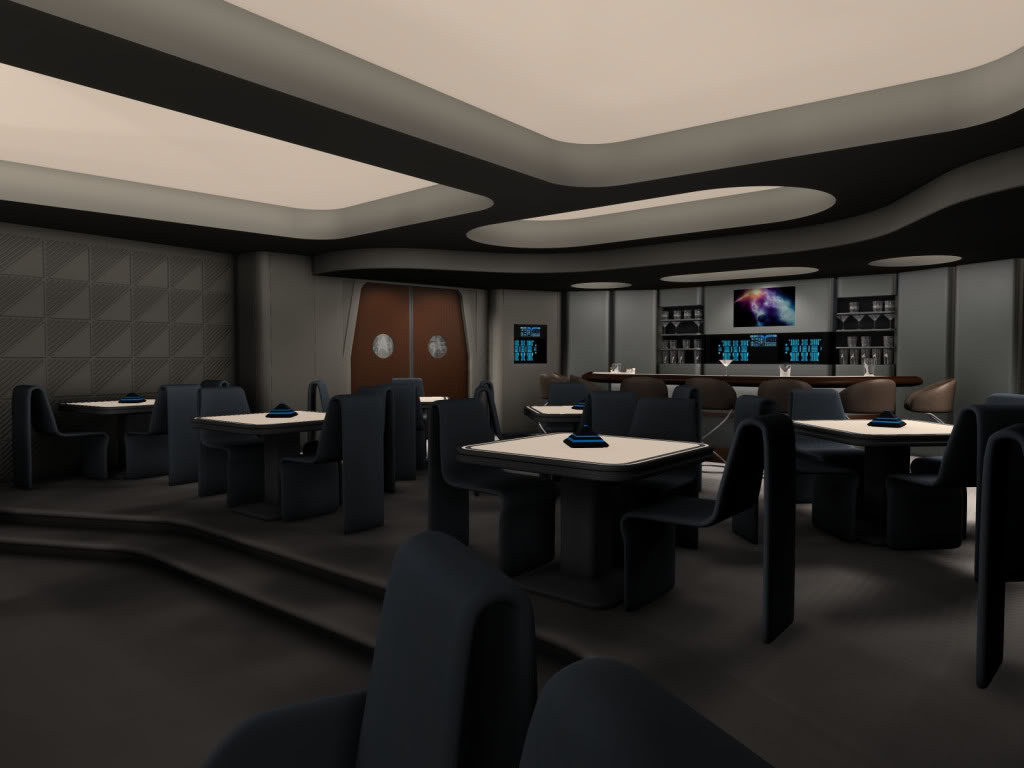 | Description | The Midway Lounge is situated on deck six at the extreme forward end of the saucer section and is designed with several large windows, which offer a spectacular view of space ahead of the vessel. The room is accessed by two doors, on the port and starboard sides at the rear of the room. The location serves as the social center of the ship and is equipped with a number of recreational activities such as three-dimensional chess, Terrace and Strategema, tables and seating, and a bar which serves several alcoholic and syntheholic beverages. Two replicator terminals behind the bar are able to produce other food and drinks. There are also dedicated wait staff which serve patrons both at the bar and at the tables. They are generally civilian members of the crew and wear uniforms. The Midway Lounge can also be used for many official shipboard functions, such as weddings, diplomatic gatherings, the change of command ceremony, birthday and other parties for individual ship personnel, concerts, poetry readings, and funerals. In case of low-power or emergency situations, The Midway Lounge is a designated emergency environmental support shelter. |