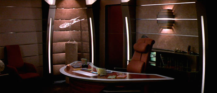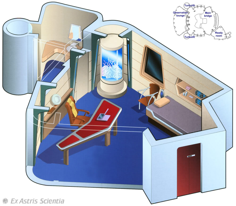 | Description | The captain's ready room doubles as an office and a second private cabin in addition to the commanding officer's private quarters. It is located off the starboard side of the main bridge on Deck 1, and provides a place where the captain can work or rest while remaining next to the bridge in case of an emergency. Meetings between the captain and one or two people also take place here. In one corner there is a simple, narrow bed with a small bookcase over it. Toward the rear of the room is a desk with a computer console. In a corner behind the desk is a doorway which leads into a bathroom containing a sonic shower. Below a mirror is a sink that has no visible controls; the water comes on automatically when hands are placed beneath the faucet, and goes off when they are withdrawn. |